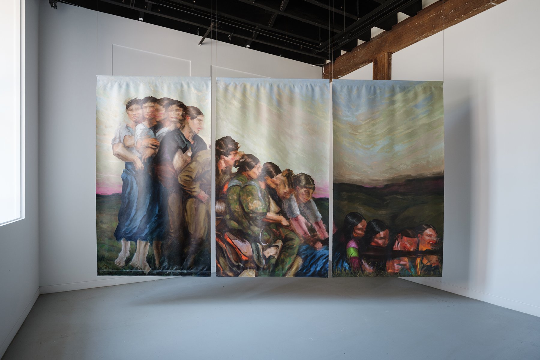 This exhibition presents Palestinians and the profound effect of their resistance as breathing presences of culture, memory, land, song and human experience. These works speak through broadly imposed silences and indifference, navigating the slipperiness of erasure with concrete gestures of care. Gauze stitched for wounds; clay pressed by many hands into small, shrouded figures; performance meeting physical memento; paint, canvas and paper layering histories into bodies that refuse disappearance. Here art insists on testimony, converting pain into ritual, absence into encounter, grief into a disciplined, communal tenderness. From intimate marks to public participation, each work summons attention to names, stories and futures. Here we can witness creative survival, where making exists despite censorship, neutrality and violence. It is in this reality that a collective kinship is found. Echoes of Resistance holds these fragile traces as proof that people persist, that art remembers, and that bearing witness is an evolving practice of love and accountability.