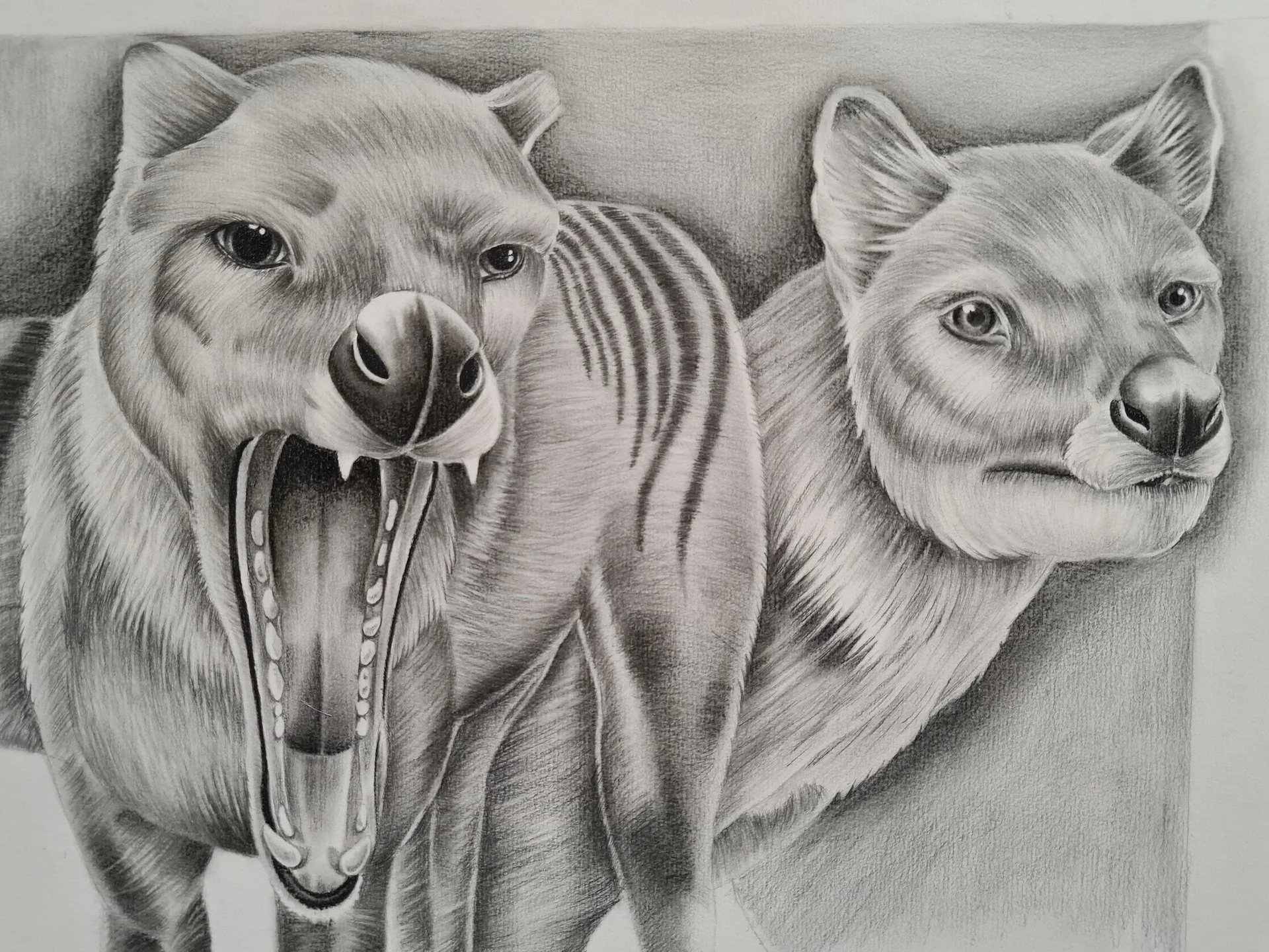 “Wiringini Tina is a mixed media exhibition that explores the history and extinction the Tasmanian Tiger and the effects its had on the Tasmanian ecosystem, most prominently the Tasmanian Devil.